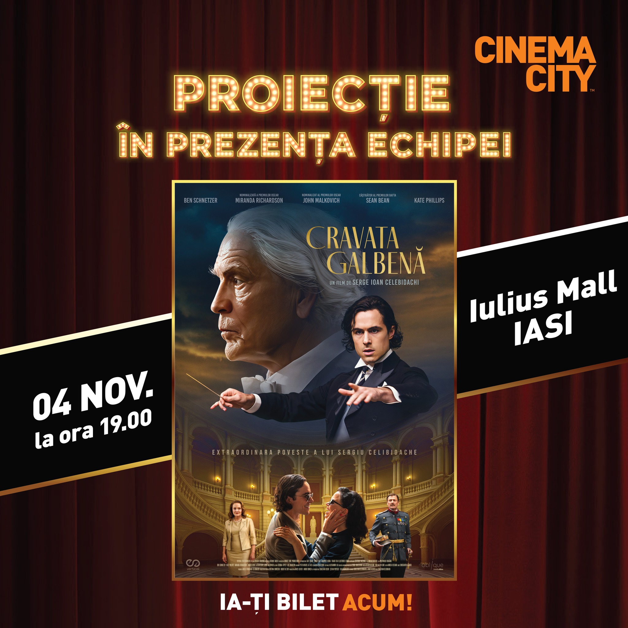 În această seară, la Cinema City din Iulius Mall Iaşi va avea loc avanpremiera filmului „Cravata Galbenă” despre viața dirijorului român Sergiu Celibidache. Evenimentul marchează prima proiecție a filmului pentru publicul spectator din România și se va bucura de prezența regizorului Serge Ioan Celebidache, fiul dirijorului. Din distribuţie fac parte actorii John Malkovich, Miranda Richardson şi Sean Bean.