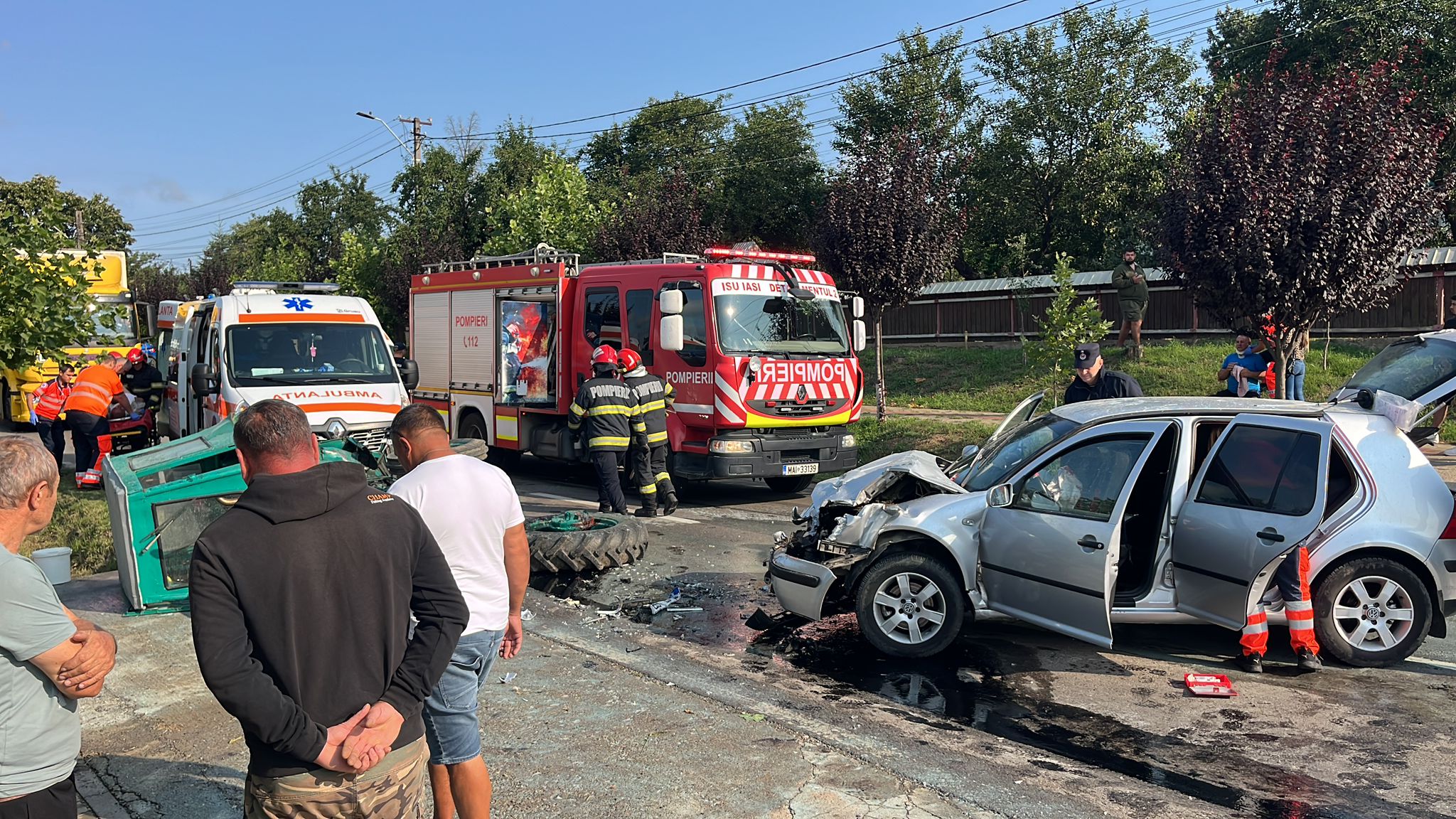 ISU Iași: Accident rutier Tomesti, in care au fost implicate un tractor si un autoturism actioneaza o autospeciala de la Detasamentul 2 de Pompieri Iași și două echipaje de la SAJ Iași, unul cu medic.