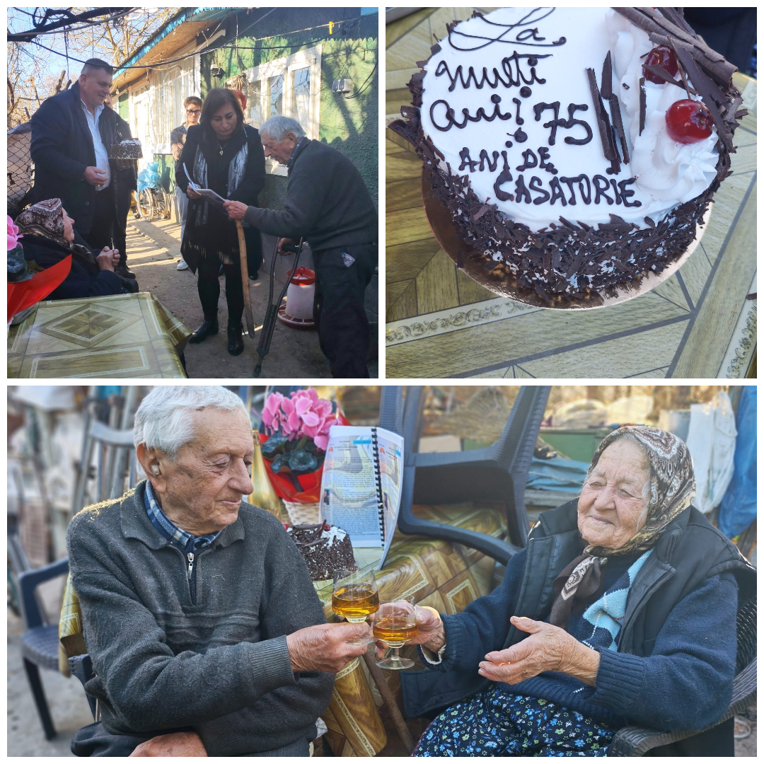 Surpriza a fost mare pentru cei doi soți care au marcat ieri trei sferturi de veac împreună în momentul în care jurnaliștii au ajuns la ei acasă la inițiativa soților Ilie și Petronela Săcăleanu, alături de consilierul local Vasile Popistasu. Nu au lipsit tortul și șampania iar tanti Maria a primit flori și s-a bucurat, cu sinceritate, până la lacrimi.