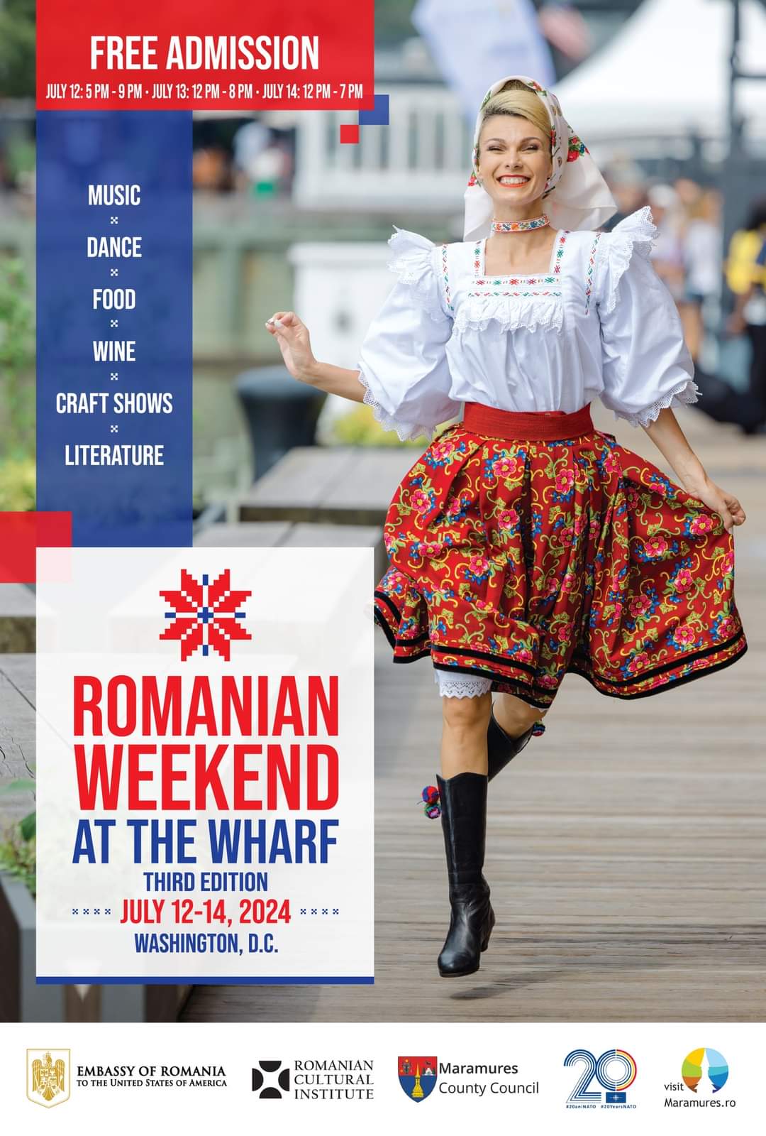 Ambasada României în S.U.A. și Institutul Cultural Român din New York / ICR New York, în parteneriat cu Consiliul Judeţean Maramureş și cu sprijinul mai multor parteneri locali, organizează, în perioada 12-14 iulie 2024, la Washington, cea de-a treia ediție a „Weekend-ului românesc de la Washington” / “Romanian Weekend at The Wharf.”, cel mai mare proiect de diplomație culturală al României în Statele Unite, dar și cel mai mare festival românesc din America. Conceput ca un eveniment caleidoscopic, de largă adresabilitate, proiectul se înscrie în programul anual inițiat și coordonat de Ambasada României „România – SUA: Un parteneriat pentru noi orizonturi economice. De 20 de ani împreună sub umbrela NATO”.