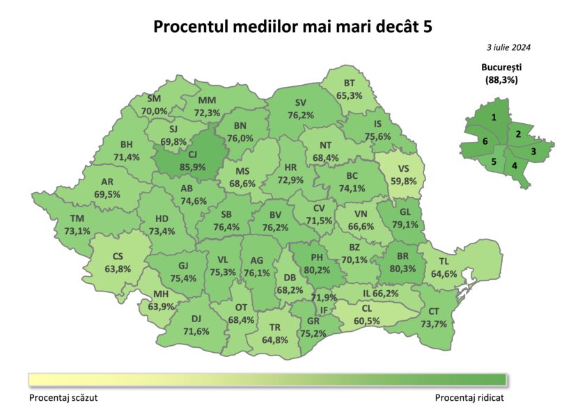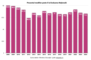 Și la nivel național se observă o scădere în ceea ce privește rezultatele obținute: 74% dintre elevii care au susținut Evaluarea Națională în 2024 au luat medii peste 5, cel mai mic procent din ultimii 4 ani.