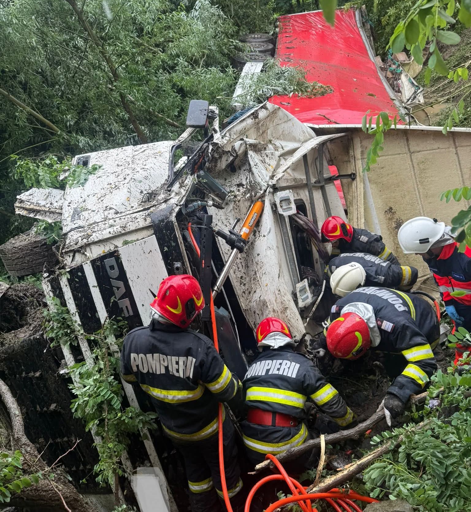Șoferul autotrenului a fost extras de către pompierii militari și predat unui echipaj SAJ, cu medic, sosit în sprijinul pompierilor paramedici SMURD.