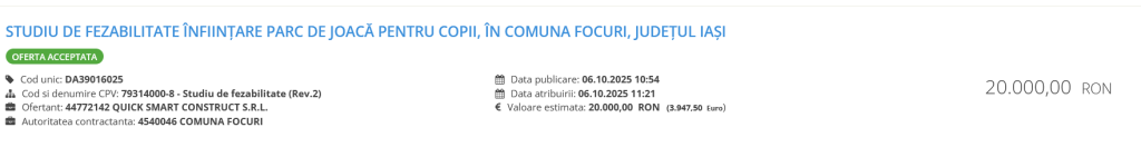 Astăzi, 13 noiembrie 2025, reporterii 24iași l-au contactat pe primarul comunei Focuri pentru a-i solicita un punct de vedere cu privire la parcul pe care vrea să îl construiască apucându-se deja de atribuirea contractelor, fără a avea însă o hotărâre de Consiliu Local.